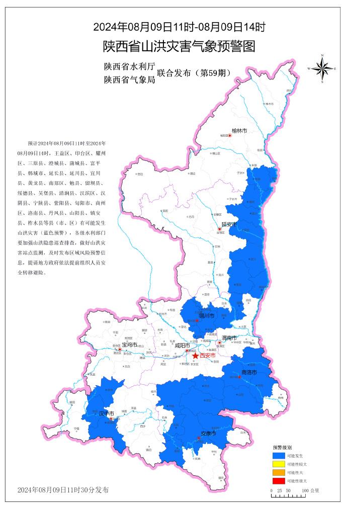 8月9日,陕西省水利厅与陕西省气象局联合发布山洪灾害气象预警:预计2024年08月09日11时至2024年08月09日14时,王益区、印台区、耀州区、三原县、澄城县、蒲城县、富平县、韩城市、延长县、延川县、宜川县、黄龙县、南郑区、勉县、留坝县、绥德县、吴堡县、清涧县、汉滨区、汉阴县、宁陕县、紫阳县、旬阳市、商州区、洛南县、丹凤县、山阳县、镇安县、柞水县等县(市、区)有可能发生山洪灾害(蓝色预警),各级水利部门要加强山洪隐患巡查排查,做好山洪灾害站点监测,及时发布区域风险预警信息,提请地方政府依法提前组织人员安全转移避险。