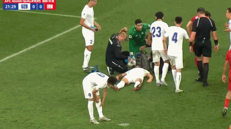 第21分钟,阿舒尔马托夫争抢中头部受伤,队医进场处理