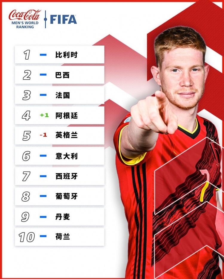 直播吧2月10日讯 今天FIFA官方更新了男足国家队排名,比利时、巴西、法国前三,阿根廷升至第四。