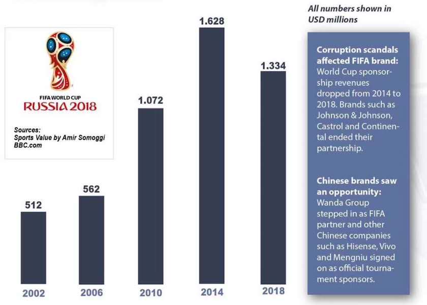 但是,根据尼尔森体育发布的2018世界足球报告,FIFA在本届俄罗斯世界杯期间的收获的赞助收入相比上一届2014年巴西世界杯有所降低。