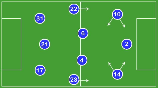 锋线球员回撤,变阵4-2-3-1为了弥补此套阵型在防守时边路的弱势,两名攻击型中场,7号与11号,会选择向边路拉开,而此时锋线上的球员10号回撤至中路,填补前腰位置上的空缺。