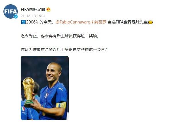 直播吧12月18日讯 2006年的今天,卡纳瓦罗当选FIFA世界足球先生。
