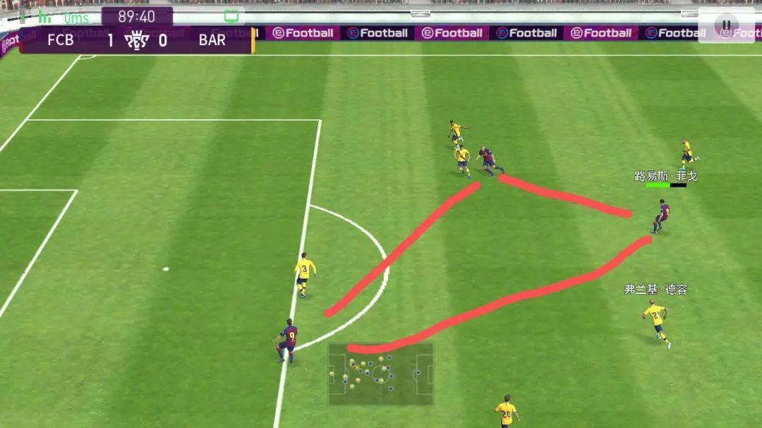 3.前腰也是个比较推荐的位置。前腰和右边卫一样,不会触发高产边锋的风格。因而在实战中,菲戈的跑位比较偏向于B2B,在下图中我们可以看到,前腰位的菲戈和两个中场几乎站在一条水平线上,而进攻的时候也会比较积极的伸手示意(图截的不是很好哈哈哈哈哈哈可以实战自行感受一下)。