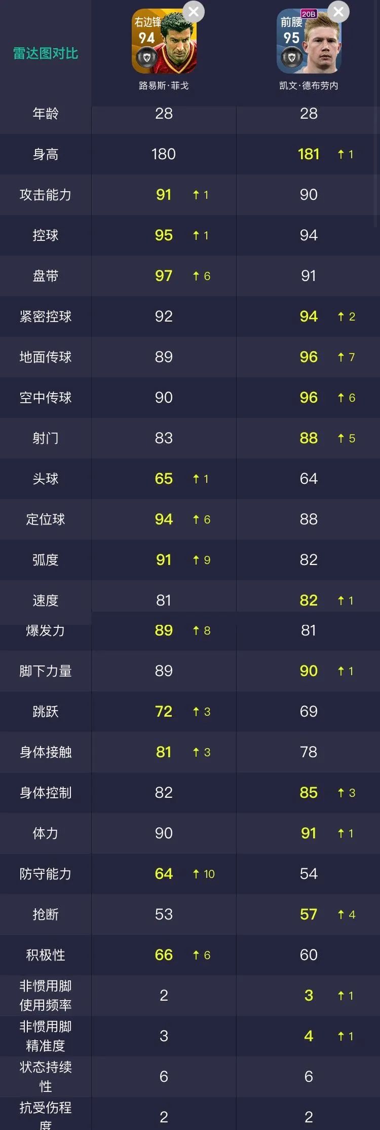 可以看到,两者大部分的数据还是蛮接近的,菲戈的盘控、速度、定位球稍微好一些,盘控的技能也多。丁丁的传球、射门略微占优。不过菲戈虽然传球不如丁丁,但是菲戈多了一个单触啊!!万年没有单触的丁丁真的哭晕在厕所。如果是斜上箭头的菲戈,在雷达图上就基本把丁丁给包起来了