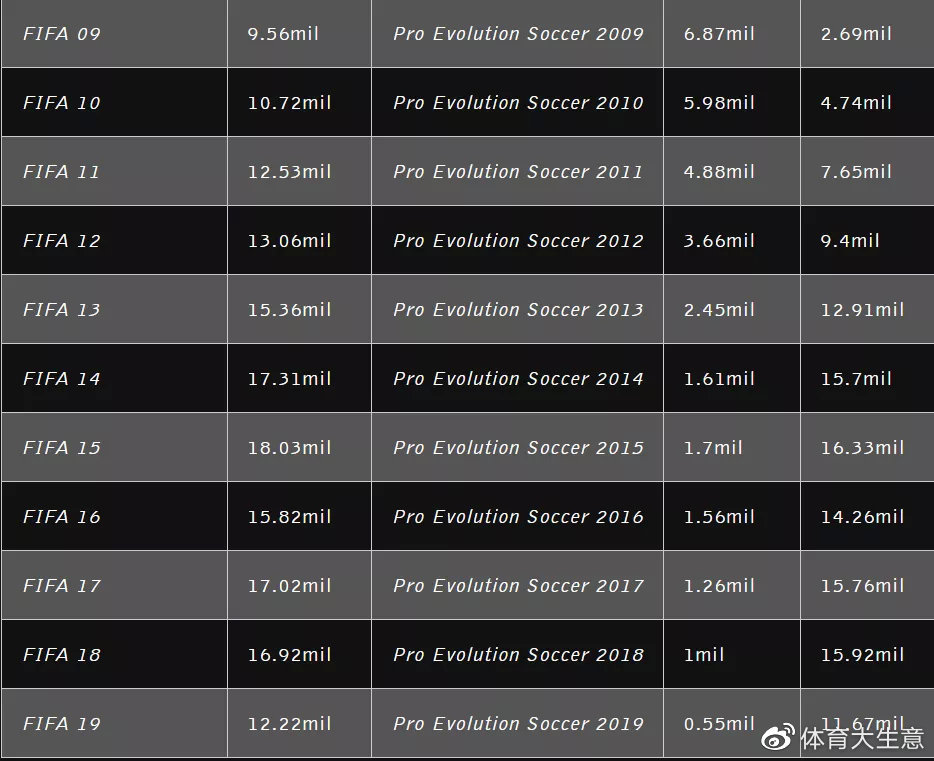 从近几年的市场表现来看,“实况”系列的处境非常糟糕。自2008年起,“实况”系列就已经难以与FIFA在销量上抗衡。并且在2009年,FIFA推出了Ultimate Team模式后,凭借版权上的优势,FIFA和“实况”的销售量差距更是被越拉越大。从FIFA10开始,FIFA每一作的销量都突破千万,与之相比,“实况”在《实况足球2014》以后,销量过百万都是很勉强的事情,《实况足球2019》更是仅有55万销量。