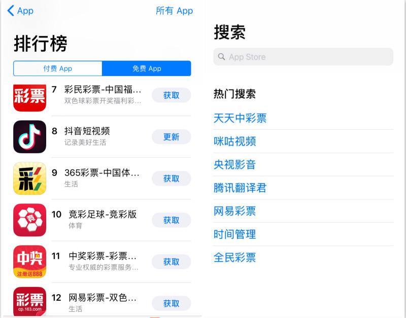 如今,随着2018年俄罗斯世界杯的开启,这种似曾相识的景象仿佛有重燃的局面。界面新闻今日在App Store免费榜单上看到,互联网彩票App的排名变动非常大,以前进榜单的相关App都寥寥无几,如今,排名前十的App中就出现了三家互联网彩票公司,另外在热门搜索中,互联网彩票App也均有上榜。