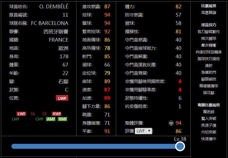 亲测简评:新赛季登贝莱升黑并改为左边锋后,其持有量和使用率会相对于现在有明显降低,因为当前有很多玩家使用他是为了打造妖人阵或金球阵,当他升黑后,不如使用明显更强的阿扎尔、马内、斯特林等同风格同位置巨星,但可以考虑依然用他打右边锋,持有精确传中技能进行下底传中助攻。