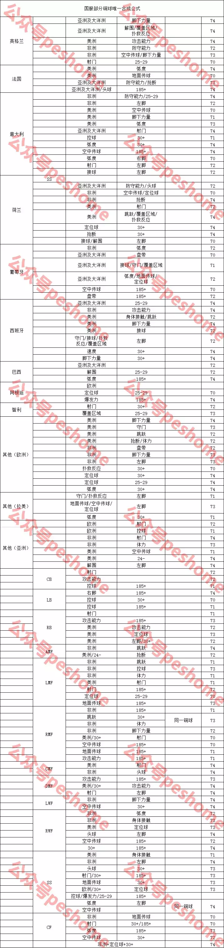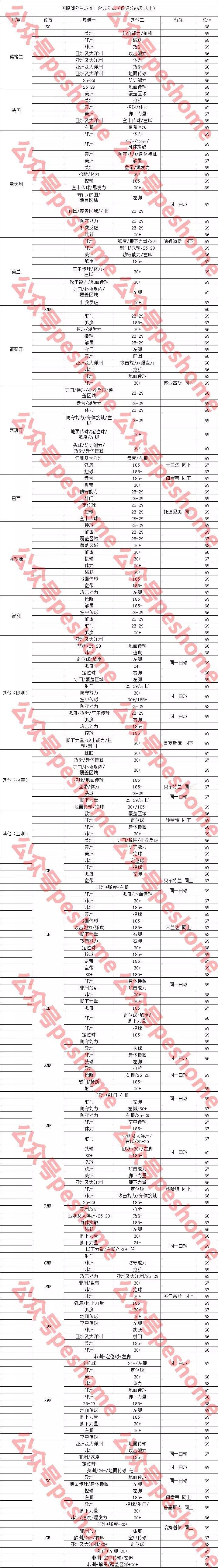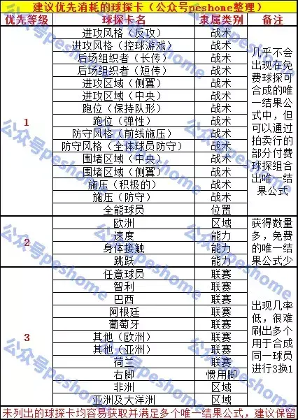 由于唯一合成公式太多,而联赛和位置两种类别的球探相对比较重要,故同时用到联赛和位置球探卡的此表不再列出(仅两种球探就能合成唯一球员的除外),这样既便于玩家收集,又提高了合成效率,另外,非洲和亚洲及大洋洲球探卡也不宜掉落,请玩家参考时自行斟酌,白球评分65及以下、稀有联赛、任意球员和全能球员不再列出。