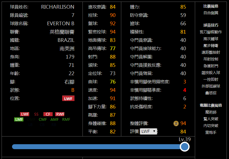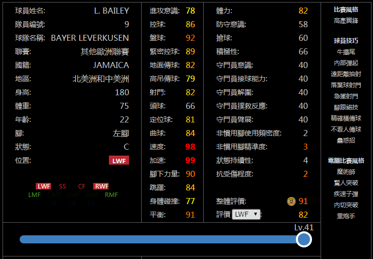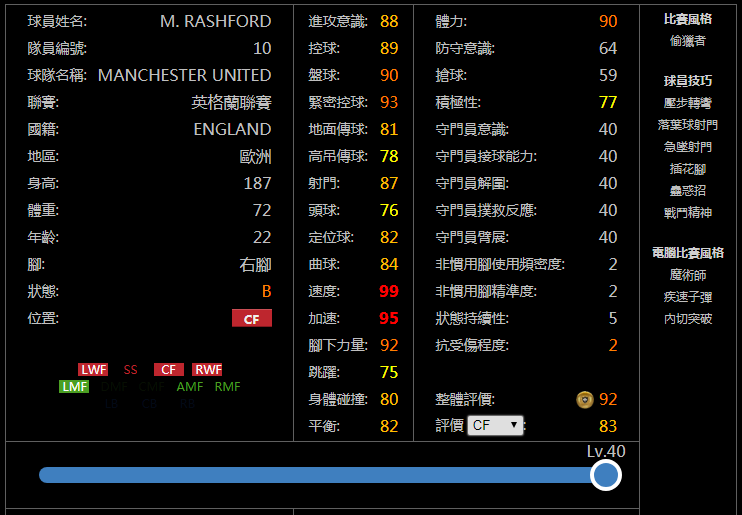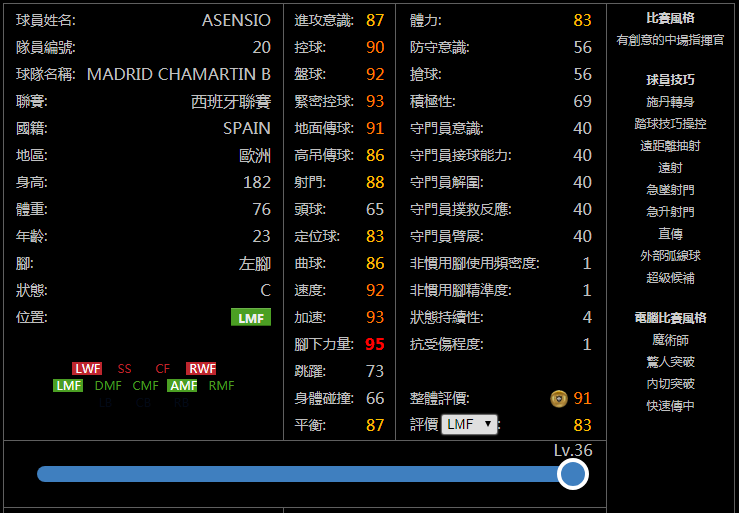亲测简评:新赛季随着妖人们经验总值大幅度降低,满级杀伤力更强的罗德里戈等人应该会更受玩家们欢迎,而因为进攻AI不到80,导致走位效果比较一般,并且是顺足拉边打法的贝利在左边锋的地位很可能会降低,打左前卫会好很多。