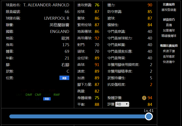 亲测简评:在边后卫中数一数二的身体模型,完美的速度、对抗、双防和敏捷结合,单看纸面实力谁都知道他强,你问我他实际用起来会不会水掉,我告诉你他绝对表里如一。