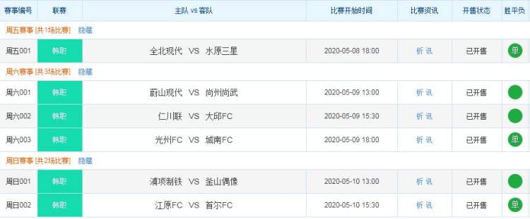 记者今天上午登录中国竞彩官网,竞彩足球受注赛程显示,5月8日-5月10日,将有6场韩职比赛开售,其中5月8日1场(周五)、5月9日3场(周六)、5月10日2场(周日),每天均会开售1场胜平负单关。