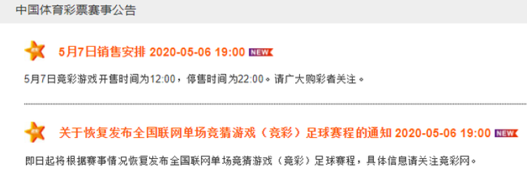 北京时间5月6日19:00,竞彩官网发出公告:即日起将根据赛事情况恢复发布全国联网单场竞猜游戏(竞彩)足球赛程。