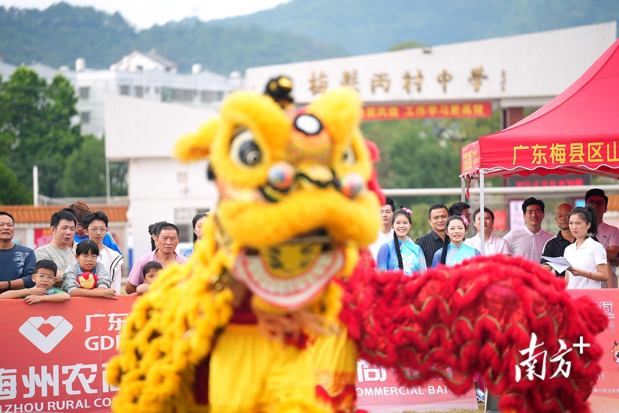 9时30分左右,阳光冲破云层洒在草坪上,每片叶子都像被镀上了一层金色。一金、一红两头色彩艳丽的“雄狮”在锣鼓声中登场,仿佛吹响了集合号,把四面八方赶来观赛的人召集到了草坪中央。人们趴在临时搭建的围挡边,把暖场表演区围了个水泄不通,饶有兴致地观看舞狮、歌舞、变脸等表演。