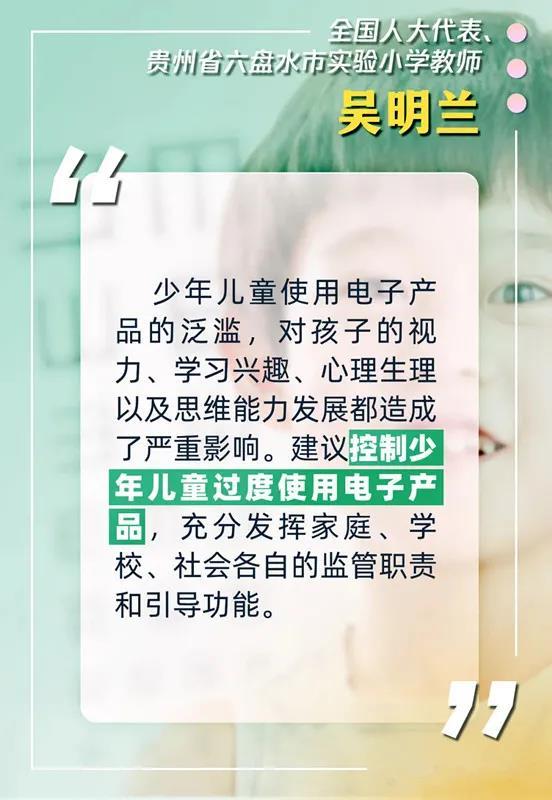 “一个iPad解放了年轻的父母,却把数以亿计的眼镜架到了中国孩子的鼻梁上。对于手机、平板电脑等对眼部健康更易造成危害的电子产品,有关部门应要求生产商提供儿童视力防护标准,并在其产品外观和使用说明中标注此产品可能造成的视力损害,对消费者尽到应有的告知义务。同时在动画片和电子游戏中加播护眼提示,包括:环境照明条件、适宜的观看距离、正确的观看姿势以及适度的观看时间等护眼提示,帮助孩子从小养成良好的用眼习惯。”