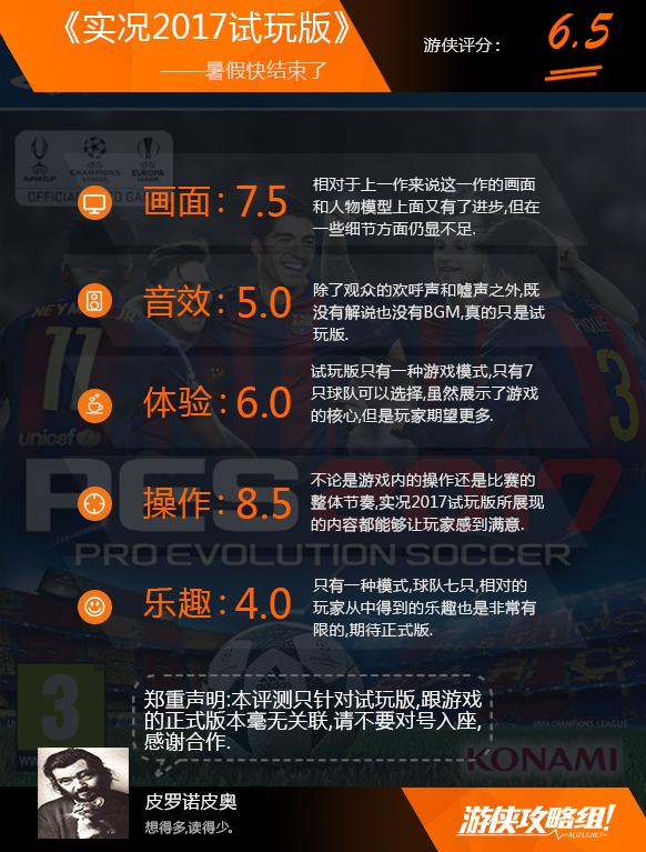 不过要说什么没有得到展现的话,那一定是自适应AI了,应该是比赛模式的问题,至少在试玩版中我认为AI是不具备这个功能的,在足球游戏中最简单的破门方式就是下底传中,在实况2017中这个方式也是屡试不爽,用假动作晃过防守球员然后传中进球,或者通过直塞撕开防线,然后传中破门,或者通过高位逼抢然后下底传中,总之没有什么AI是一个下底传中解决不了的吗,有的话就用两个。而在试玩版过程中,并没有发现任何自适应AI的迹象。如果是正式版才有的话,那也不错。总的来说,实况2017的画面仍然不是其侧重点,游戏性方面略有提升(从试玩版看来),其他方面的话还是要等待正式版出来才能一识庐山真面目。
