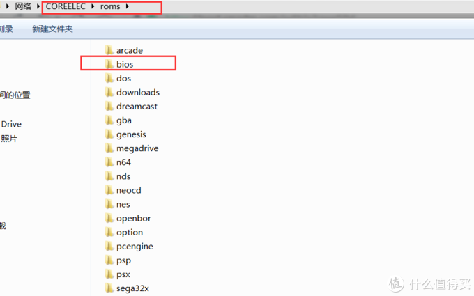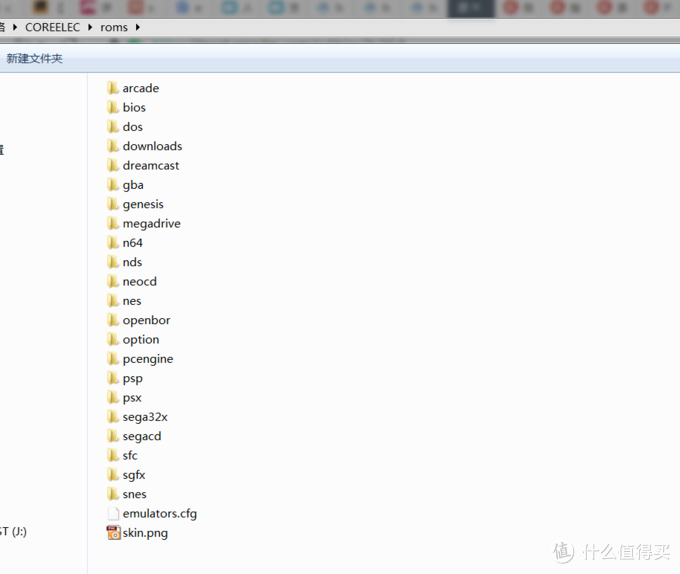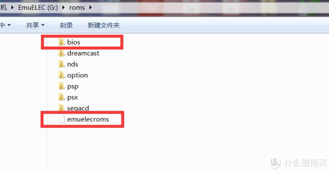 格式化成NTFS或者FAT格式后,直接在移动硬盘上创建rom的文件夹,然后再创建单独机型的文件夹(建议小写),关键的一步是创建一个emuelecroms的空文件,并建议把之前EmuELEC系统中rom下的bios目录整个拷贝过来,否则有些检测bios的机型比如dreamcast会无法运行游戏。