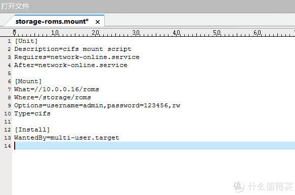 创建systemd挂载描述文件。我这里举例的是全roms路径挂载,所以是storage-roms.mount(其他的子目录格式为storage-roms-子目录名.mount,比如storage-roms-psp.mount)。还是可以用windows创建空记事本文件,然后去掉txt的后缀名来实现。然后编辑内容为: