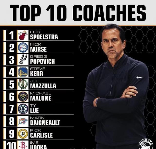 第一名是热火队的斯波教练。这个排名应该没什么争议。他能让次轮秀都打出超水平发挥,而且在阵容并不出色的情况下两次带队打入总决赛。