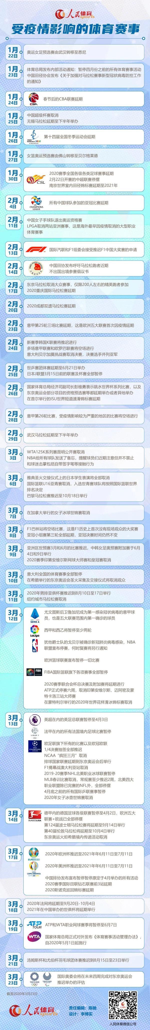 受新冠肺炎疫情影响,全球大型体育赛事相继延期或取消,中超CBA国内两大职业联赛、欧洲五大足球联赛、北美四大职业体育联盟无一幸免,国际奥委会也在研讨包括推迟举行东京奥运会在内的多个方案。在全球疫情仍面临着严峻挑战的日子,和人民体育一起,回顾一下因疫情爆发而确认延期或取消的重大体育赛事。希望这条时间轴就此终止,不再延长。也希望早日迎来全球战疫胜利的那一天,待春暖花开,一起去享受和珍惜体育带给我们的快乐。