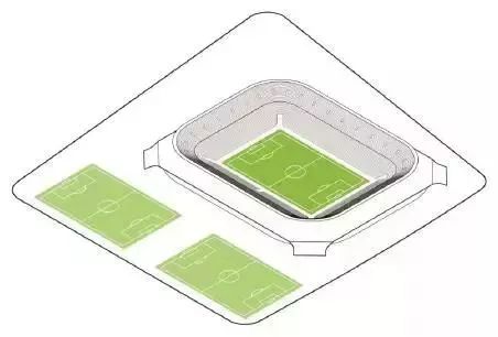 足球场整体沿南北向布置(北偏西15°),主球场西侧设置两片室外训练场,形成中轴方正、平整对称的格局。