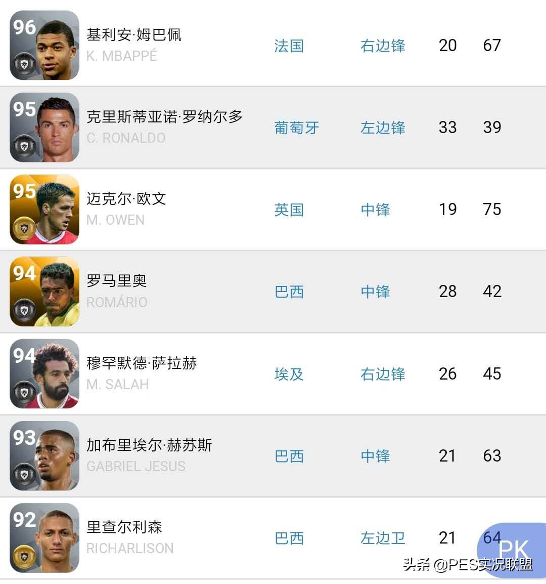 很多人说新引擎中球员速度不再重要,这是一个误区。历代实况足球,无论游戏引擎如何迭代,速度型球员永远吃香是亘古不变的真理。新引擎三大神锋(欧文、理查尔利森、罗马里奥)的速度均值是88.67(30级),就非常能够说明问题。