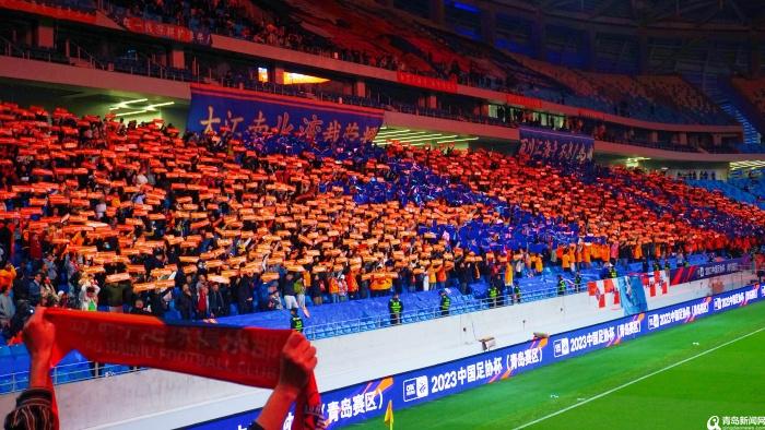 (2023年足协杯半决赛,青岛海牛VS上海申花。赛前海牛球迷举起一片围巾墙,共同庆祝球队成立30周年)