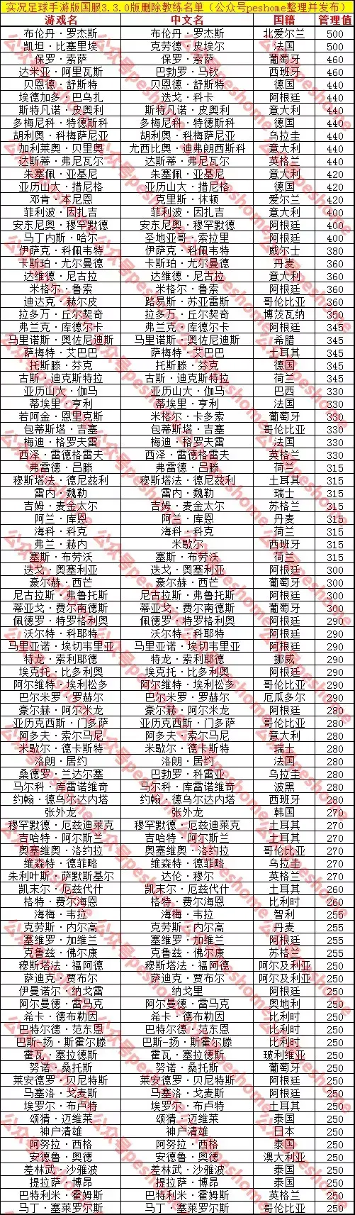 各位晚上好,本周为大家带来的盘点内容是实况足球手游国服3.3.0版删除的教练名单,本名单中的教练如果是在7月18日下午4点之前从3.2.0版本中签入,那么依旧可以在3.3.0版中使用;但如果在3.2.0版之前没有签入自己的球队中,那么这些教练将不会在3.3.0版的教练列表中被刷出,其中就包含3前腰阵型的人气低管理值教练措尼格。本名单由本号指定粉丝群管理员坤搜集并分享。