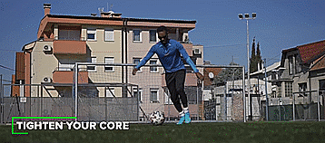 当我们后摆时候,胸部要稍微前倾,收紧身体核心,这将使我们更有利于摆动腿,增加射门的力量。