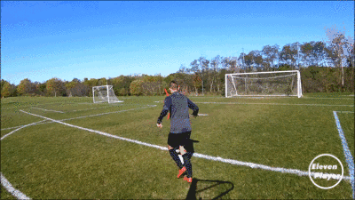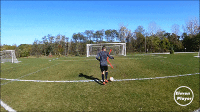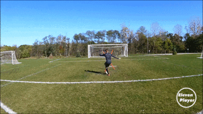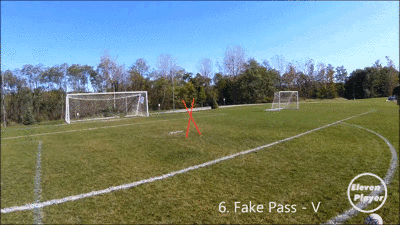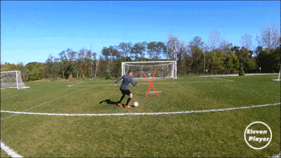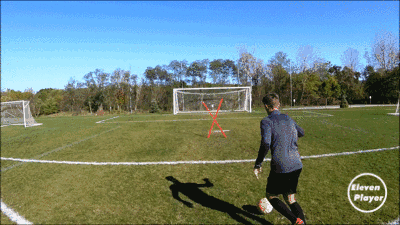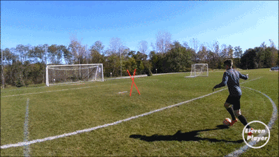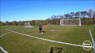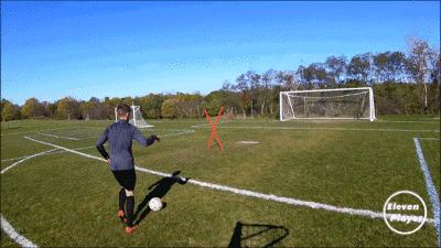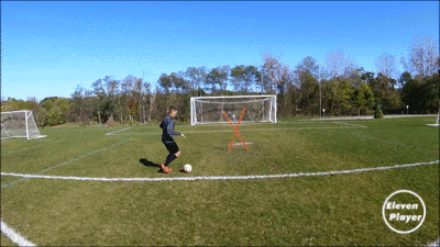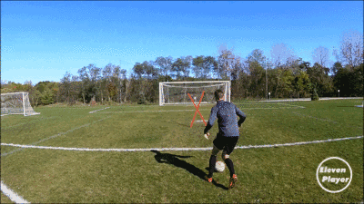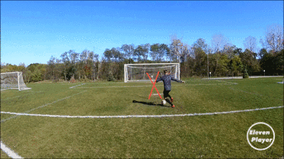 在今天的练习中将会用两个标志杆交叉的插在球门前点球点附近,用来模拟防守者。之前咱们“十一人"发过很多关于各种过人的练习方法,其中不乏很多视频中的示范老师会邀请一名自己的朋友来充当防守者的角色。个别小伙伴会觉得这个“防守者”有点故意配合,完全没有想要抢断的意思。