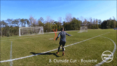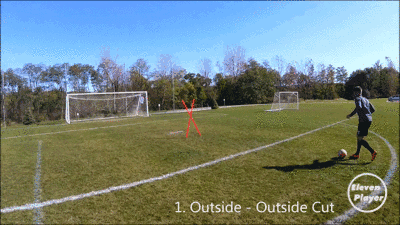 然后再次用自己的右脚外侧吧球向右前方拨去。