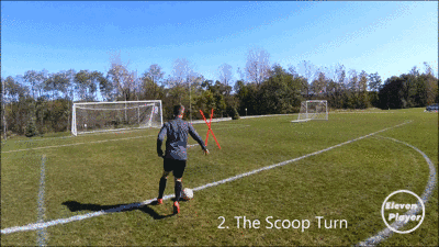 最后在左脚落地的过程中用脚内侧把球向右前方拨去。