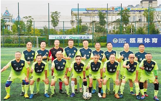 温州老年足球队部分队员留念。后排右三为金志敏,后排左一为王开成。