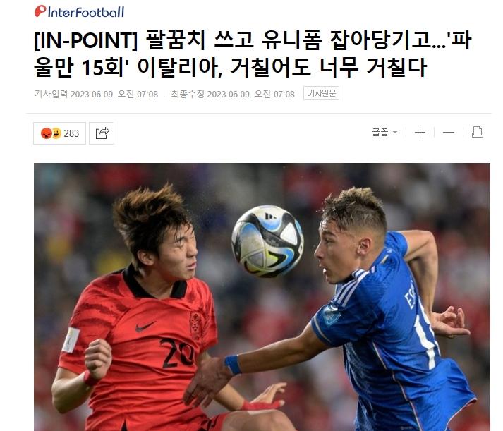 直播吧6月9日讯 U20世青赛半决赛,韩国U20 1-2遭遇意大利U20的绝杀,无缘决赛。韩媒Interfootball发文指责意大利的粗暴犯规。