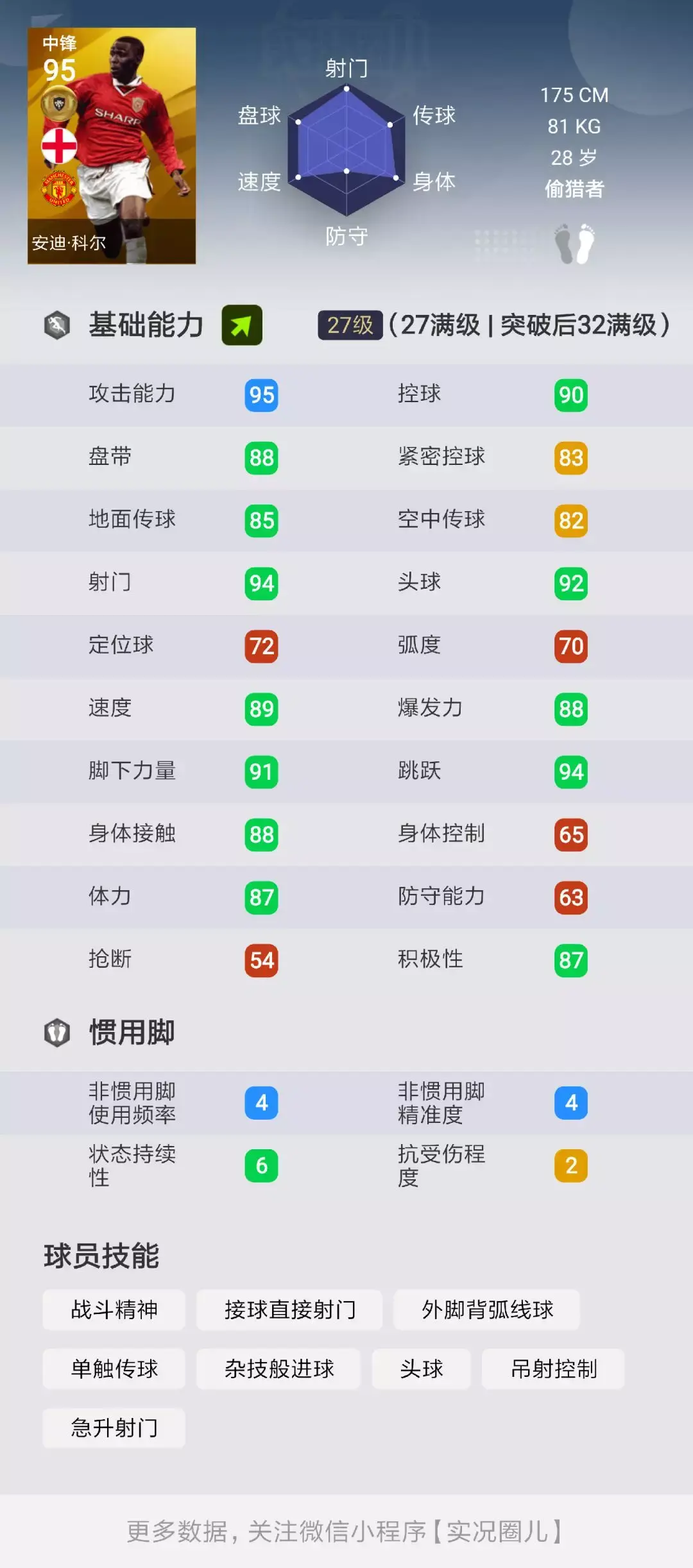 其实安迪·科尔的实力很不错,尽管不是毕业级,至少在状态固B的加持下,他作为一个偷猎者中锋,他的进攻AI、射门、速度和对抗4大属性下限很高,平均超过了90;