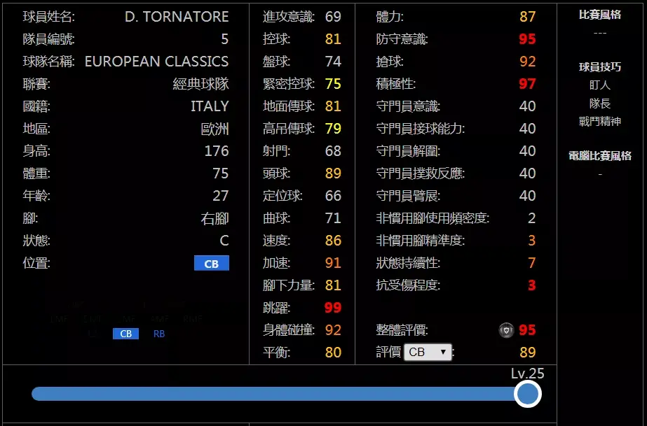 看上去有点像是进攻端被砍成残废的巴雷西,但由于速度更快,超过了85,可以说是打边置中卫的极佳人选;