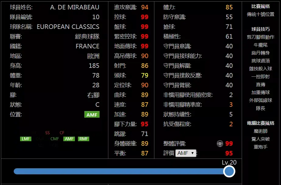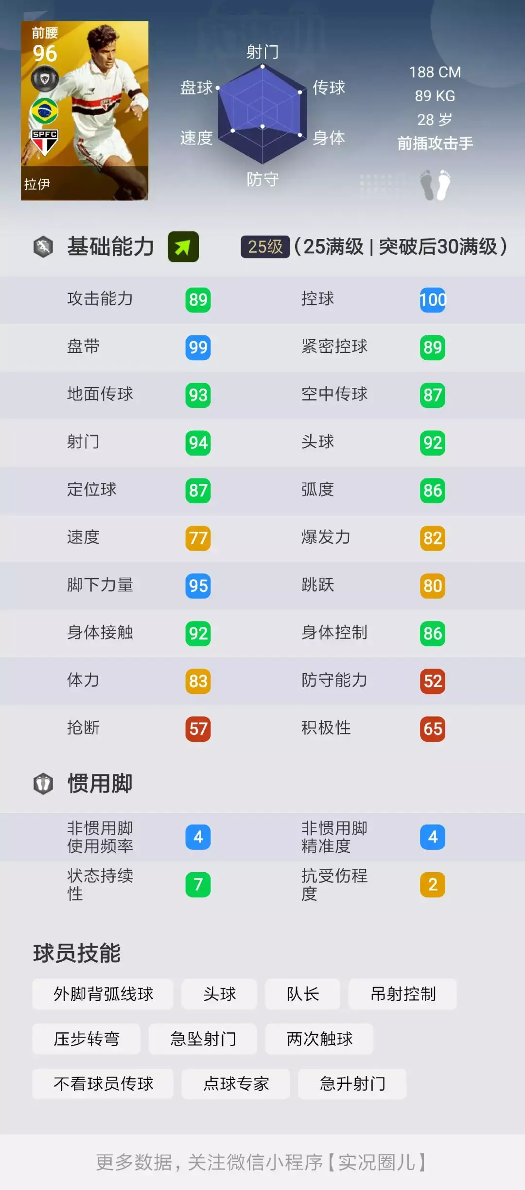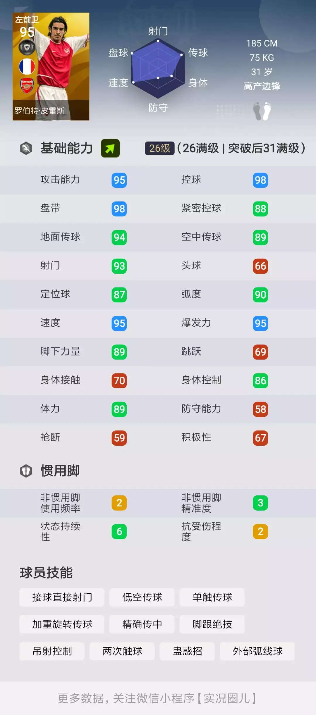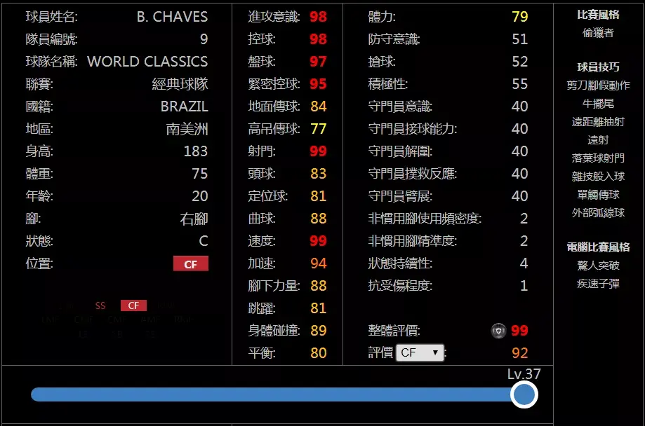 至于他的实力方面,可以从状态固B加持的属性直接看出来,除了CR和理查利森等个别人,他有的缺陷其他左边锋都有,而他强项之处比很多同位置风格的球员更强,平均全部过90甚至95,自带1个重要盘带技巧,1个重要射门技巧,5个重要传球技巧,模型也比大部分左边锋好,成为天梯第2绝对是有这个实力的。