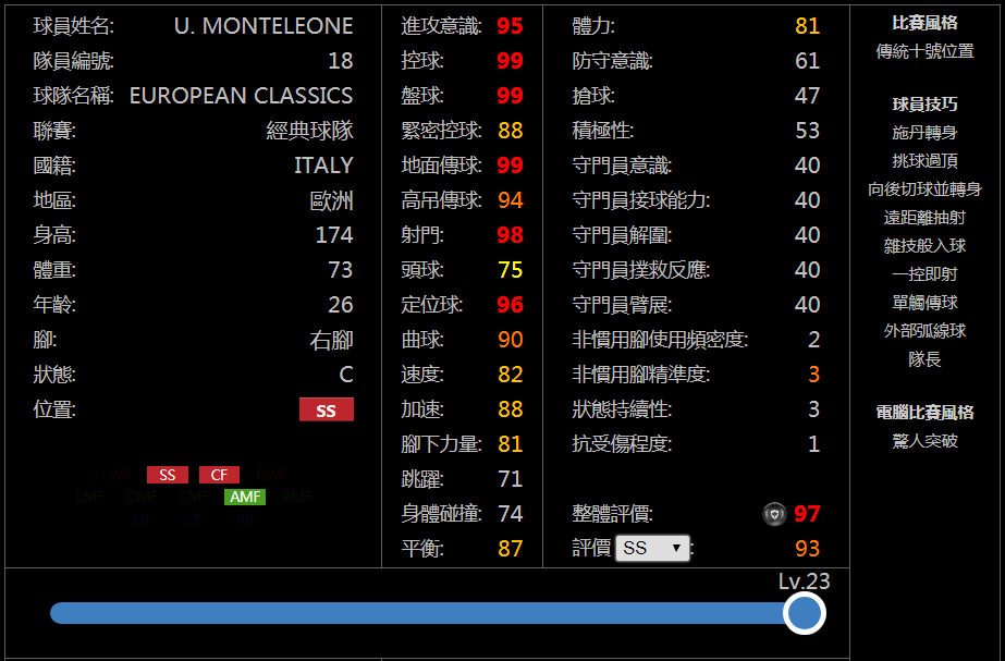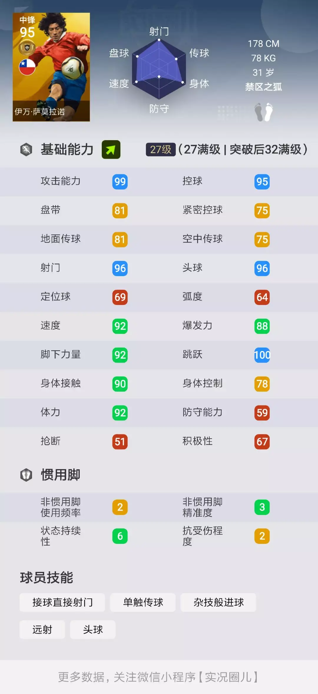 同时萨莫拉诺的控球接近95,能使他在停一些长距离空传球时能轻松做出良好的调整,接球直接射门和单触传球也能进一步帮助他把握战机,禁区之狐风格也会帮助他在进入禁区后,一些处理球的属性得到进一步隐性提升;