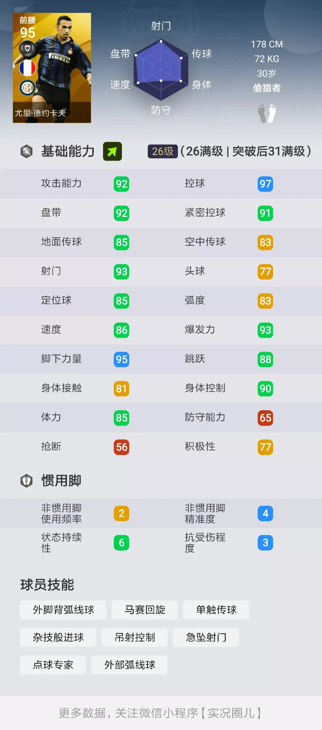 同时,盘控和短传属性也很好,接到过顶的长传能很从容的将球处理下来进行传射,而且还是一个双4脚,还自带接球直接射门和单触传球技能;