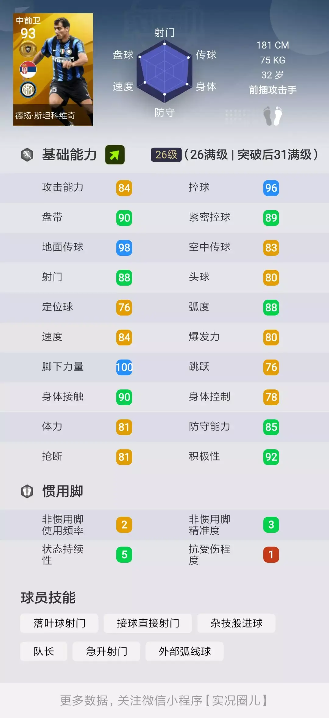 从实战的角度来说,斯坦科维奇后插上和远射都很有威力,但身体控制能力一定程度影响了他的手感,体力也是他不尽如人意的地方,虽然现实中他好像并没有这个缺点,也不知道konami在搞什么鬼。
