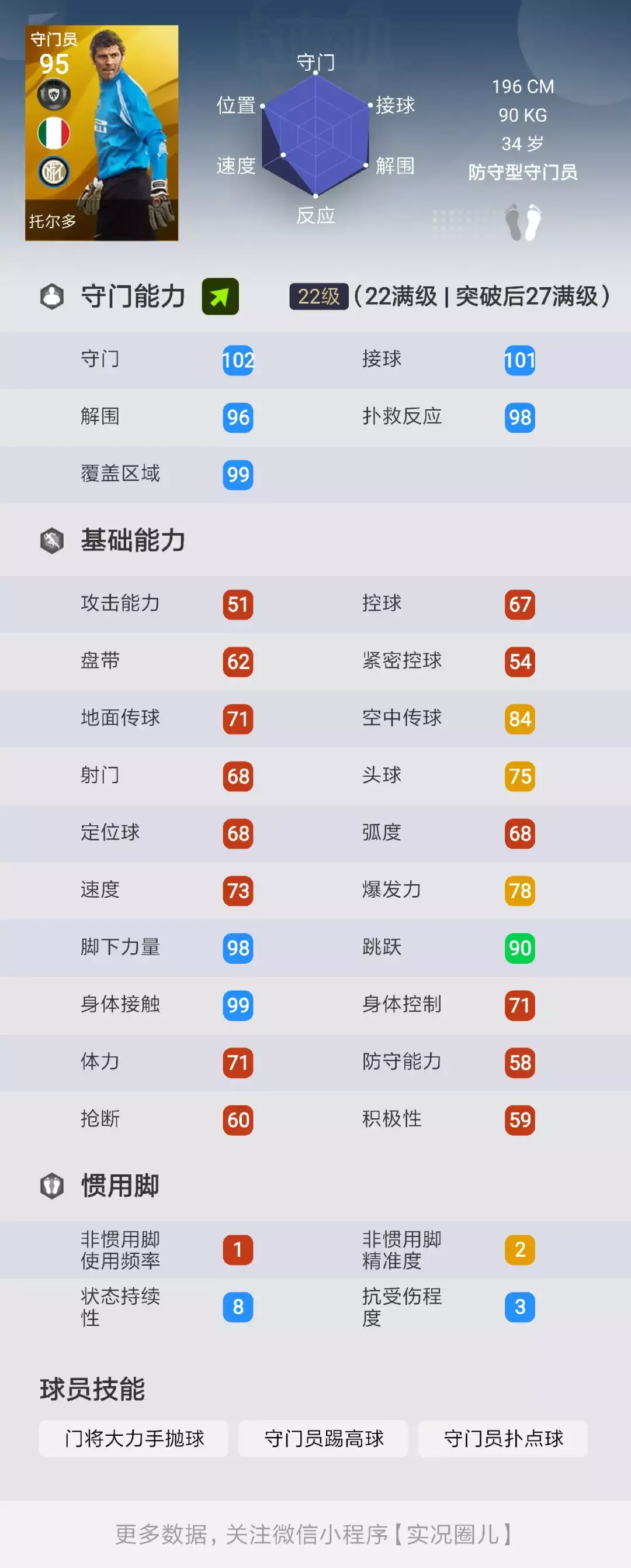 但传奇状态固B之后,托尔多的门将五围有两项破百,其他3项也达到或接近99,这为他的实力和同位置风格竞争力带来了非常巨大的飞跃。