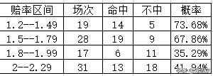 单关赔率在1.5-1.79区间中,出现28场,其中命中19场,不中9场,命中概率67.86%,可以说,这两个星期竞彩操盘手选取场次最良心的,这个区间段的盈利比蚊子肉区间段大多啦,希望老铁们以后多关注这个区间段。这里两个星期竞彩最不良心的赔率区间段是1.8-1.99,出现的场次为17场,其中命中6场,不中为11场,命中概率为35.29%,这个区间段适合走下盘,玩外围的老铁们盈利也是满满的。第二个不良心赔率区间为2.-2.29,这个区间出现为31场,命中13场,不中为18场,命中率为41.9%,还是走下盘吧。