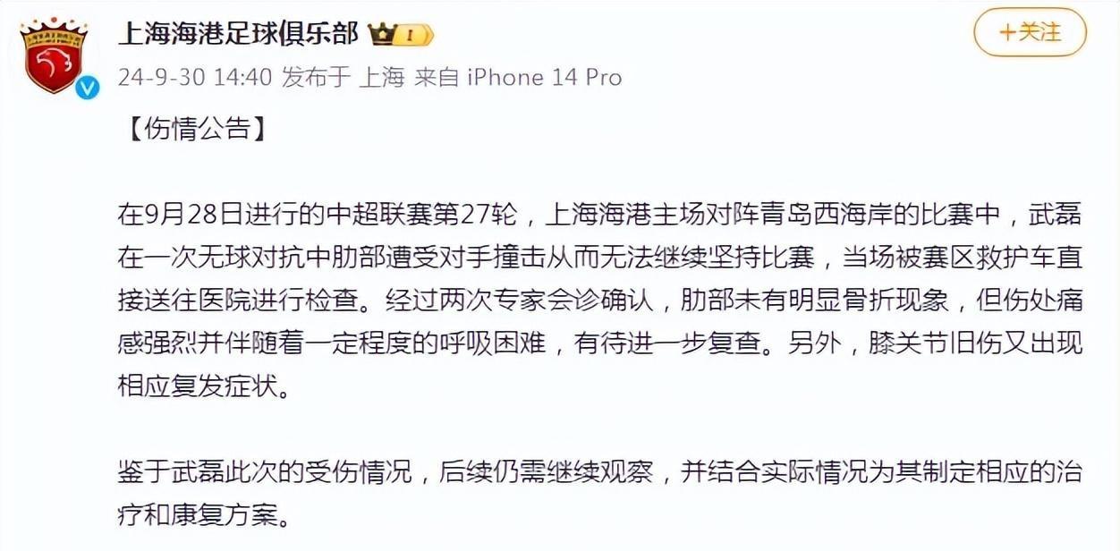 针对球员伤情方面,上海海港俱乐部于近日发布了一则伤情公告。根据公告内容,武磊在9月28日的一场中超联赛中受伤,他的膝关节旧伤复发,需要一段时间来进行治疗和恢复。这对国家队来说是一个不利消息,因为武磊一直是球队的重要攻击手。不过,教练组已表示会密切关注他的康复进展,并做出相应调整。