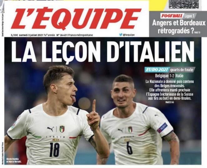 在四分之一决赛中,意大利2-1战胜了比利时,比赛中意大利在2-0领先的情况下全队众志成城,全员参与防守的同时,依然在进攻端给比利时保持压制,再次上演了一场精彩的比赛,他们的精彩表现引起了法国著名媒体《队报》的关注。