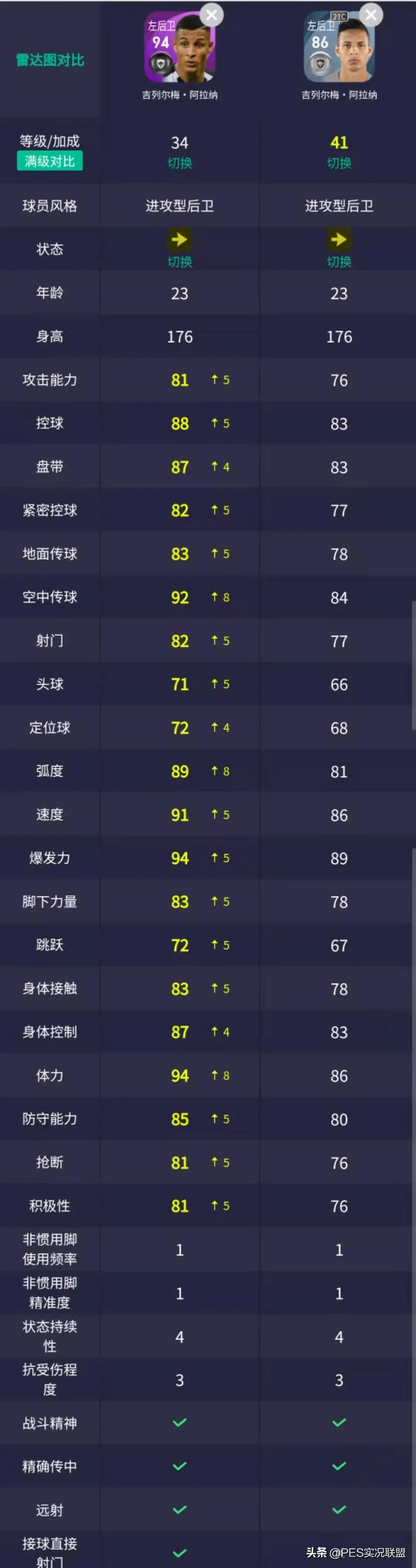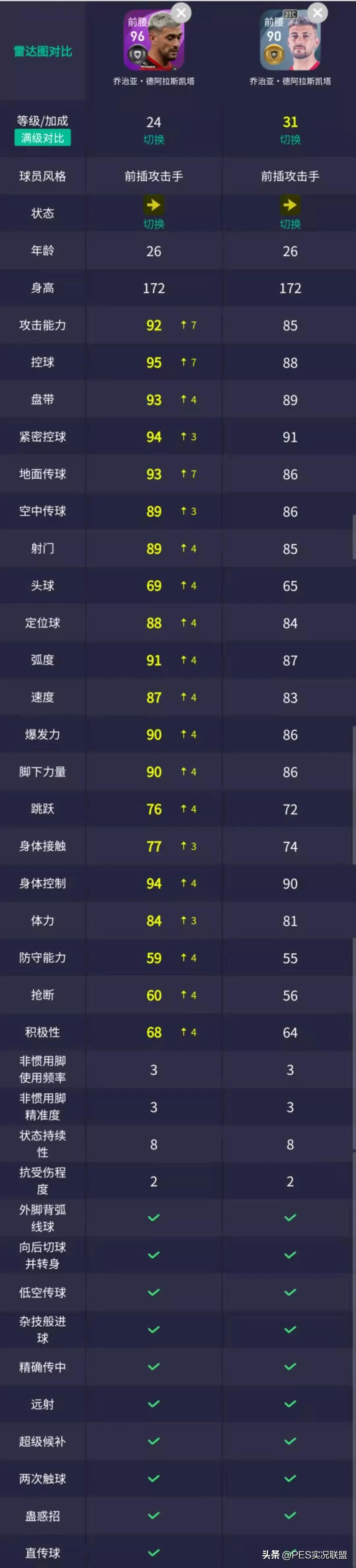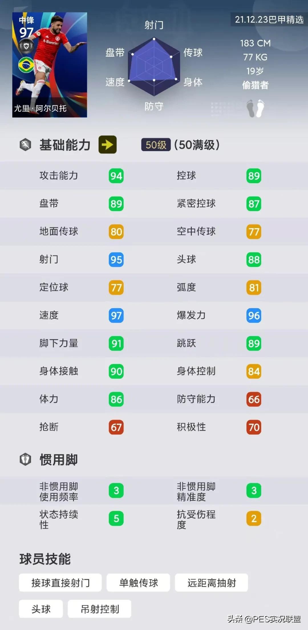 球员简析:德阿拉斯凯塔(精)虽然拥有很多T1级别数据,但模型、对抗和体力没有优势,并且射门水平也跟上一个版本相差甚远,因此整体实力尚不足以准毕业。不过由于自带超级候补技能,仍然可成为游戏中比较实用的替补人选。