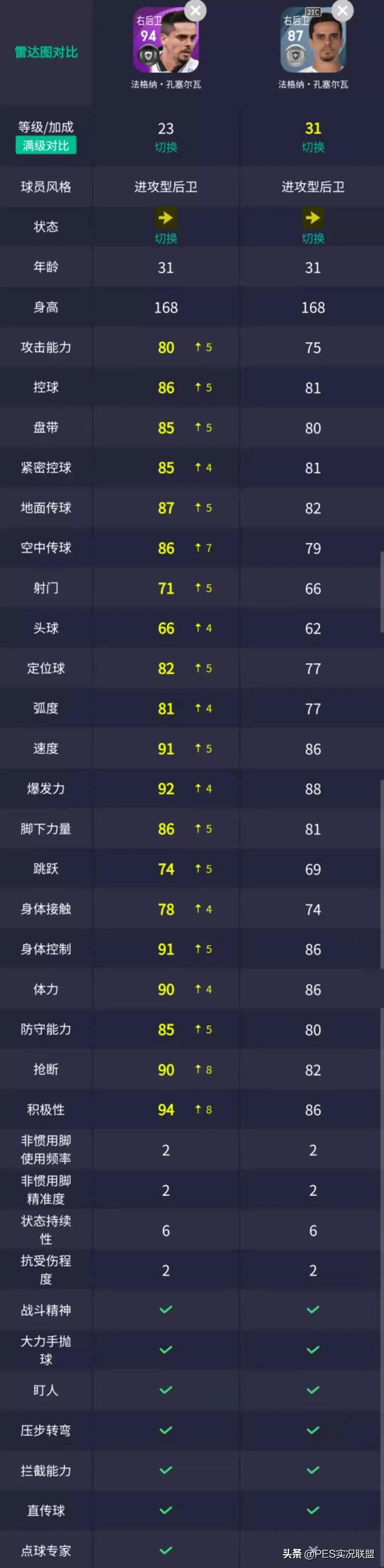 球员简析:当前游戏中强势的边后卫普遍以防守见长,而孔塞尔瓦的特点刚好相反,防守能力和身体接触只能满足基本需要,而非普遍认知的顶级水平。