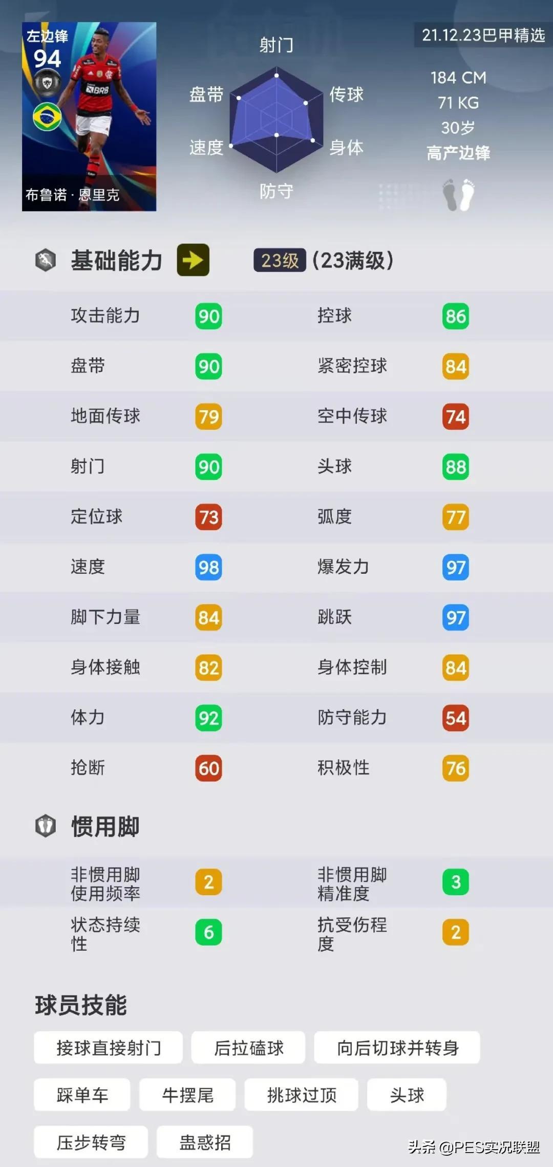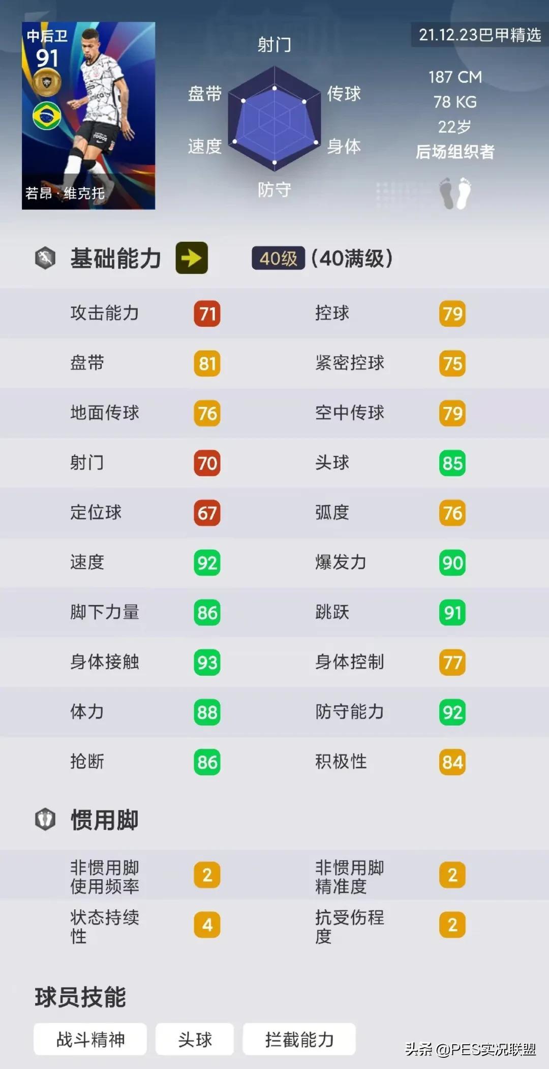 球员简析:孔塞尔瓦(精)拥有进攻型后卫的速度和助攻,同时还具备不错的防守和抢断数据,攻守两端的能力属于比较均衡的类型。但缺点是模型小,实际身体接触大概率低于数据预期,因此很难成为同位置顶级人选,仅限缺少可用右后卫的玩家入手。