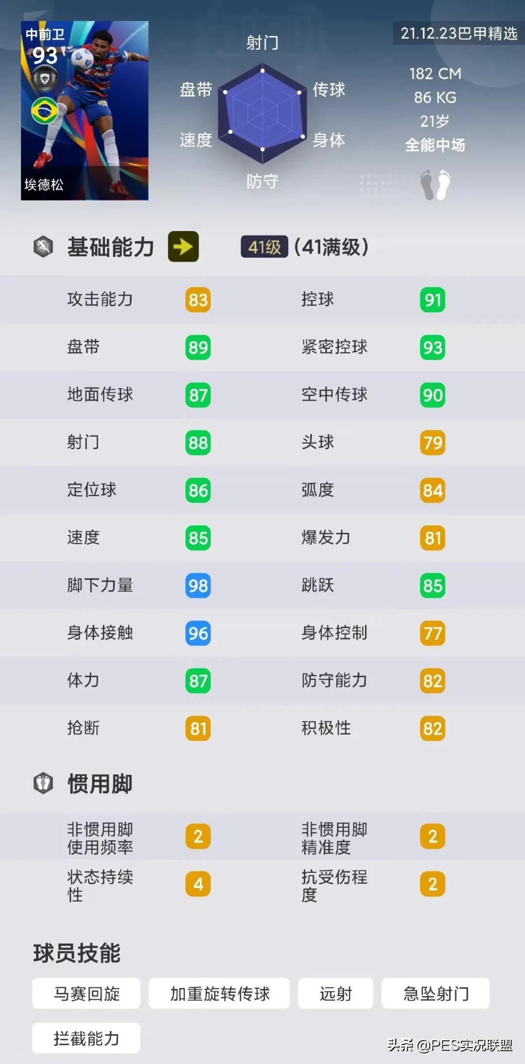 球员简析:埃德松除了平衡和头球以外的其它属性均在80以上,而且兼具模型和对抗,进可攻退可守,综合能力十分全面。但可惜状态持续性偏低,即便有实时状态的加持,大概率也只能维持一周,因此介意球员状态的玩家需谨慎对待。