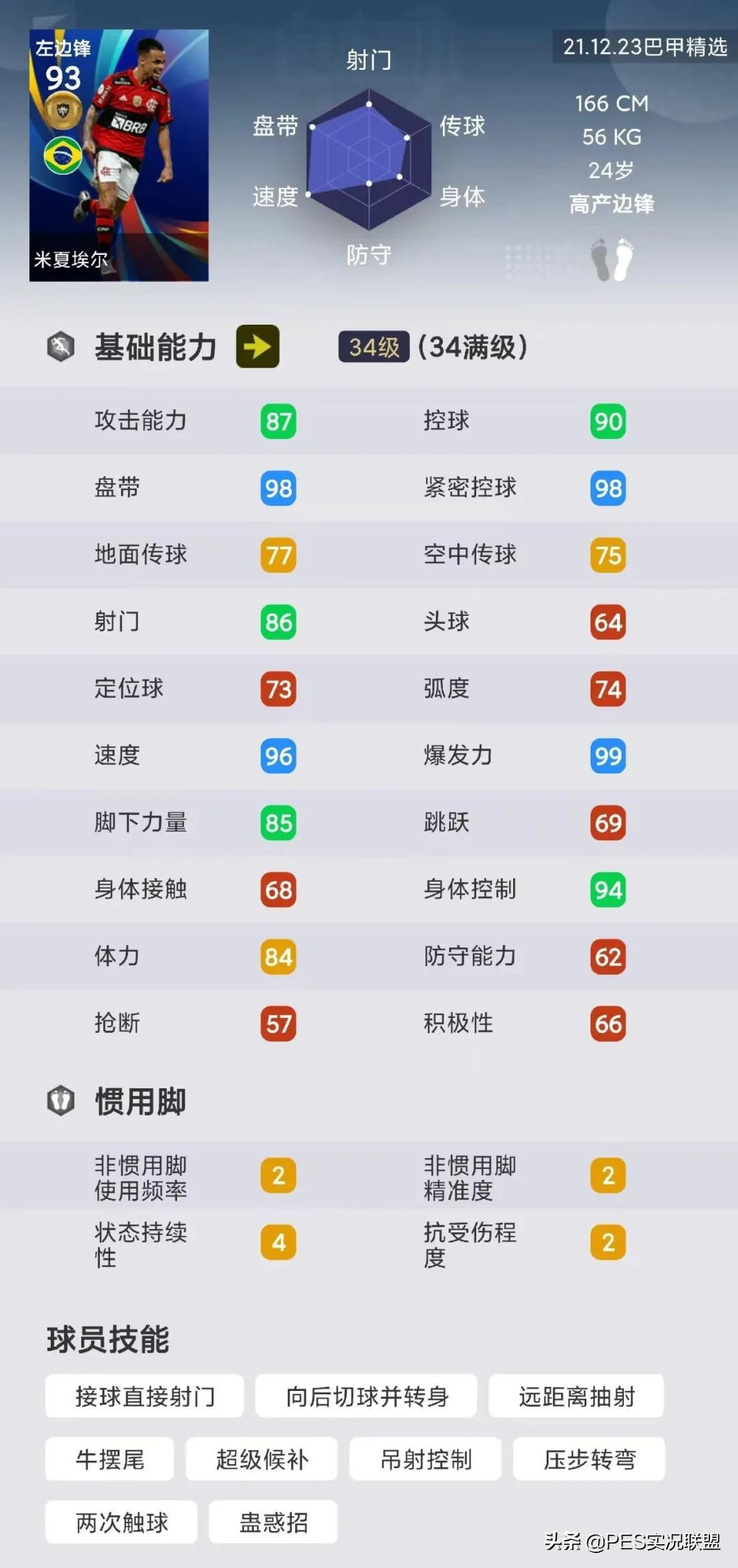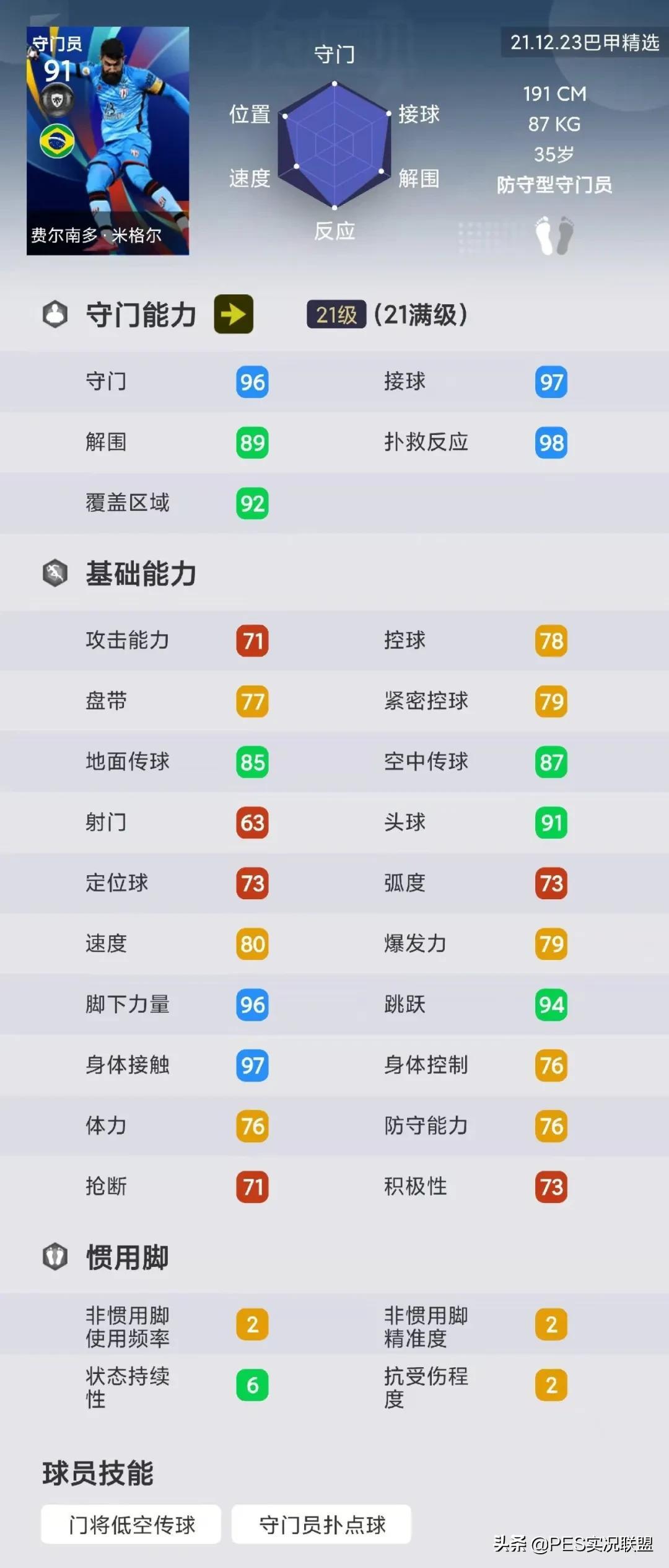 球员简析:米格尔的模型不错,但在动辄五维99的精选门将面前,他的解围和覆盖区域均存在一定劣势,即便是很多普卡门将,也要比他的关键数据更加均衡,因此非队套玩家不必抽取。