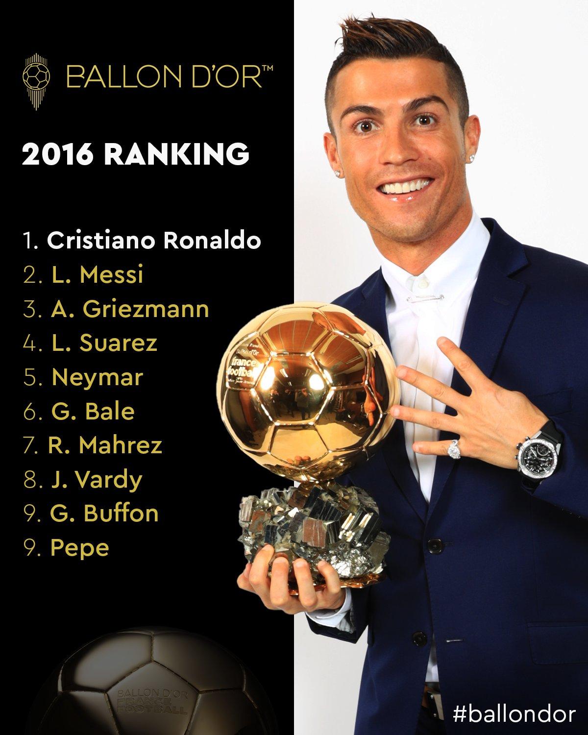 直播吧8月13日讯 金球奖官方回顾了2016年的排名,C罗第4次获奖,梅西、格列兹曼二三位。