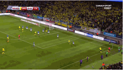 第63分钟,意大利进行人员调整,锋线两名球员沙拉维与贝洛蒂被换上。第65分钟,弗洛伦齐左路外脚背传中,球打在横梁上弹出。第74分钟,坎德雷瓦远射,皮球被瑞典门将扑在身下。